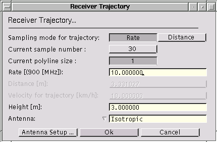 Allows to choose between different sampling modes for interactive placement of the receiver. The trajectory can either be sampled according to the frequency of the default transmitter, or according to a specified distance. Depending on the current selection, the corresponding entries to enter the values are enabled or disabled, respectively. On opening the dialog box, the rate value and the distance value represent the same sampling of the trajectory.